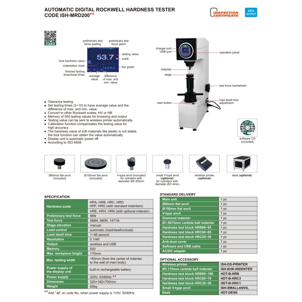 Lieferumfang: 1 x Grundgerät, 1 x Ø60mm flacher Amboss für Rockwell, 1 x Ø150mm flacher Amboss für Rockwell, 1 x Prismenamboss, 1 x Diamant Eindringkörper, 1 x Hartmetall-Eindringkörper Ø1,5875mm, 1 x Härtevergleichsplatte HRB85-95, 1 x Härtevergleichsplatte HRC60-65, 1 x Härtevergleichsplatte HRC20-30, 1 x Staubschutzhaube, 1 x USB Kabel und Software, 1 x Netzstecker Adapter