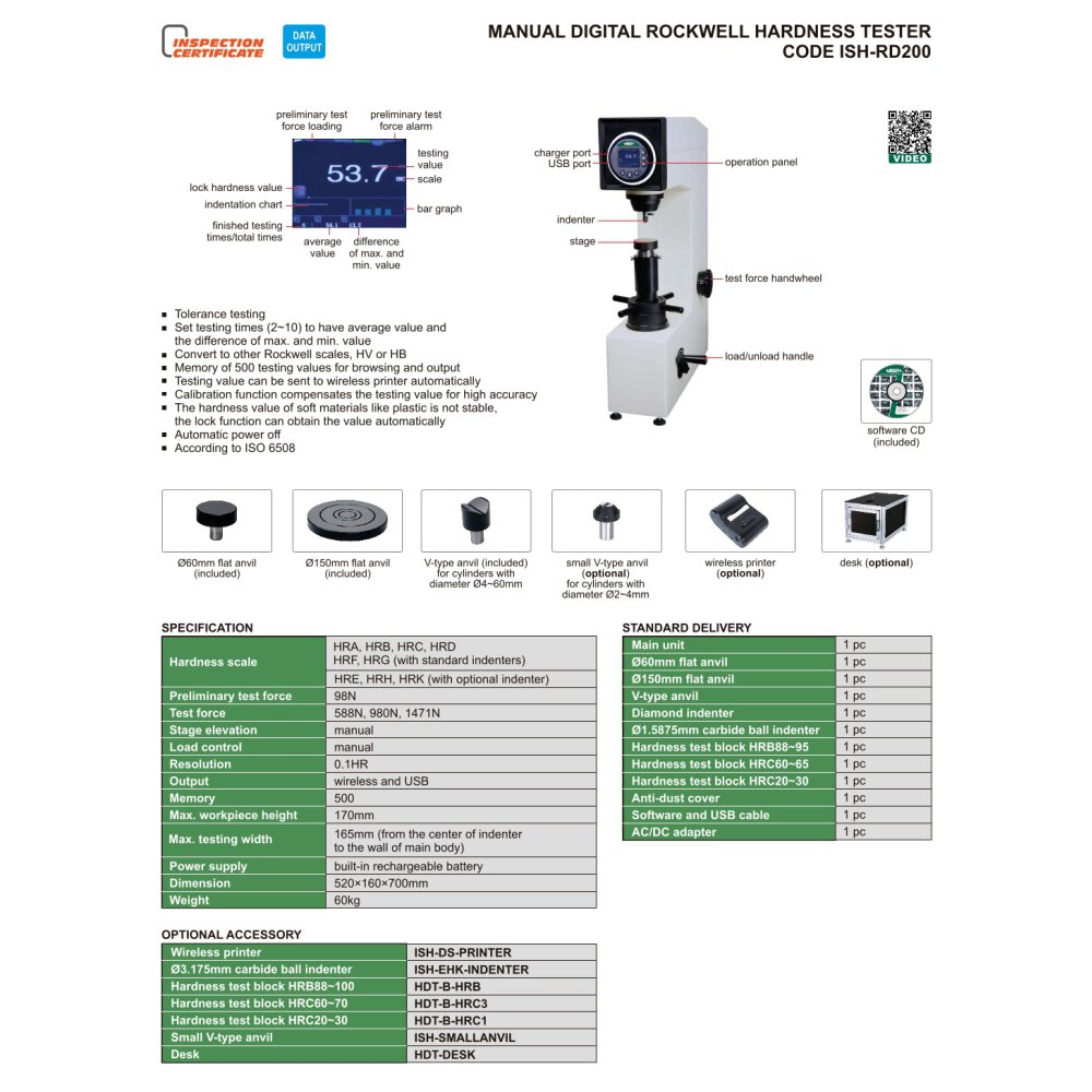 Lieferumfang: 1 x Grundgerät, 1 x Ø60mm flacher Amboss für Rockwell, 1 x Ø150mm flacher Amboss für Rockwell, 1 x Prismenamboss, 1 x Diamant Eindringkörper, 1 x Hartmetall-Eindringkörper Ø1,5875mm, 1 x Härtevergleichsplatte HRB85-95, 1 x Härtevergleichsplatte HRC60-70, 1 x Härtevergleichsplatte HRC20-30, 1 x Staubschutzhaube, 1 x USB Kabel und Software, 1 x Netzstecker Adapter