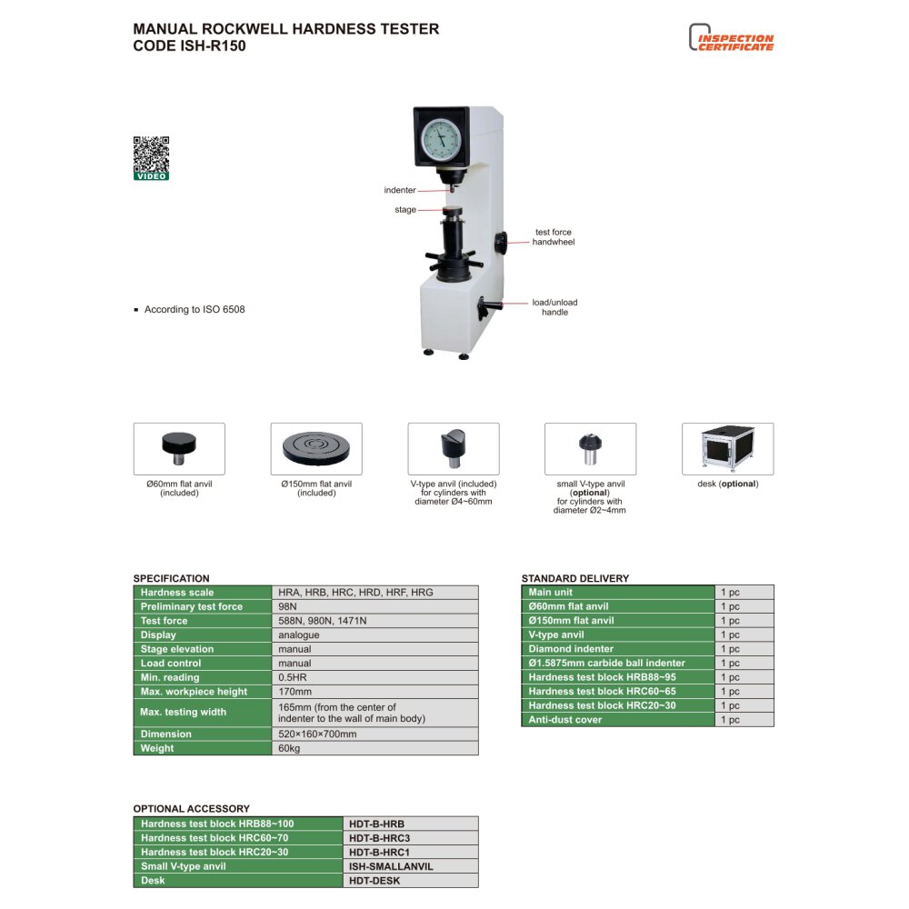 Lieferumfang: 1 x Grundgerät, 1 x Ø60mm flacher Amboss für Rockwell, 1 x Ø150mm flacher Amboss für Rockwell, 1 x Prismenamboss, 1 x Diamant Eindringkörper, 1 x Hartmetall-Eindringkörper Ø1,5875mm, 1 x Härtevergleichsplatte HRB85-95, 1 x Härtevergleichsplatte HRC60-70, 1 x Härtevergleichsplatte HRC20-30, 1 x Staubschutzhaube