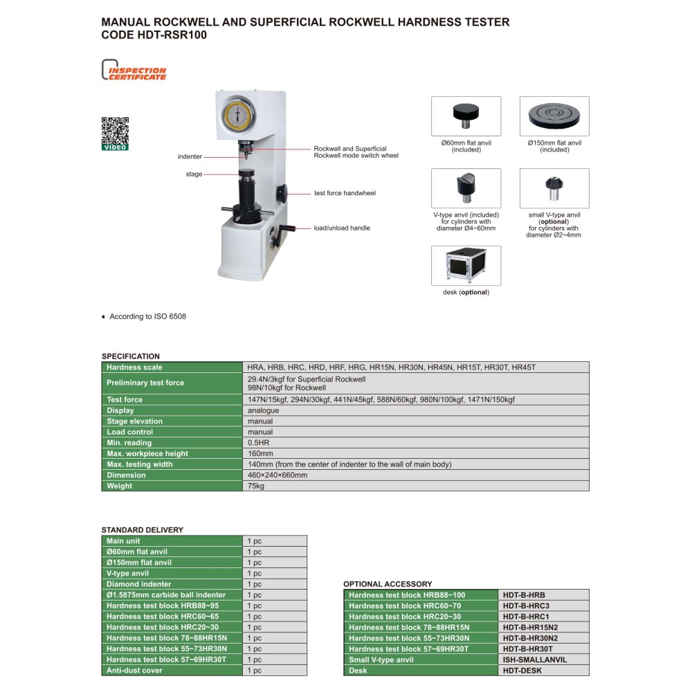 Lieferumfang: 1 x Grundgerät, 1 x Ø60mm flacher Amboss, 1 x Ø150mm flacher Amboss für Rockwell, 1 x Prismenamboss, 1 x Diamant Eindringkörper, 1 x Hartmetall-Eindringkörper Ø1,5875mm, 1 x Härtevergleichsplatte HRB88-95, 1 x Härtevergleichsplatte HRC60-65, 1 x Härtevergleichsplatte HRC20-30, 1x Härtevergleichplatte für Super Rockell 78-88HRN15N, 1x Härtevergleichplatte für Super Rockell 55-73HRN30N, 1x Härtevergleichplatte für Super Rockell 57-69HRN30T, 1 x Staubschutzhaube